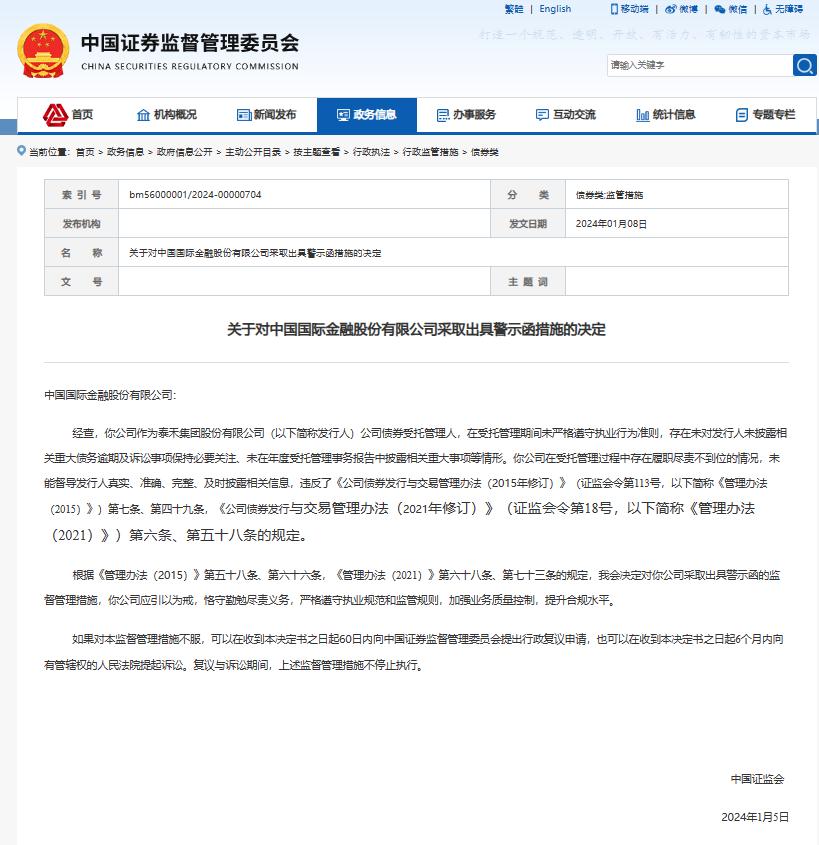 关于对中国国际金融股份有限公司采取出具警示函措施的决定