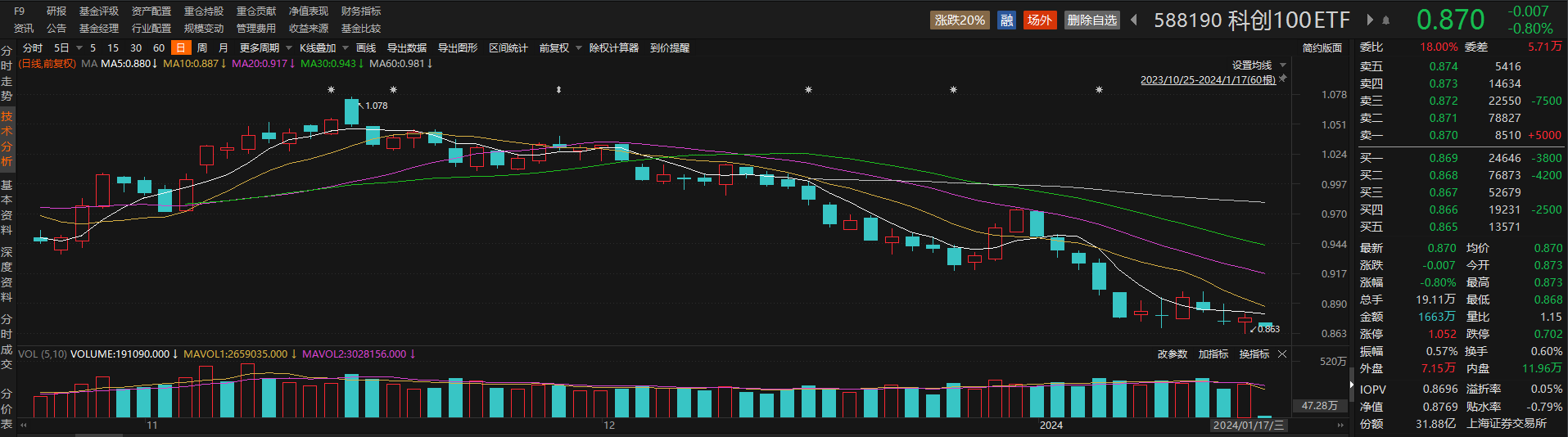 跟踪科创100指数的科创100ETF(588190)早盘走低,但盘中现溢价交易。截至发稿,该ETF下跌0.80%,溢折率为0.05%。
