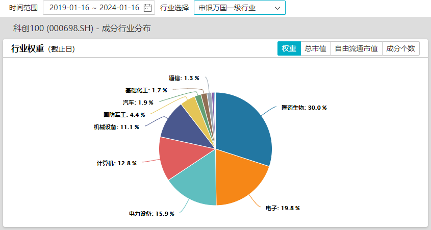 最新数据显示,从成分股所属行业权重来看,按申万一级行业分类,医药生物行业为科创100指数(000698)第一大权重行业,权重占比高达30.0%。
