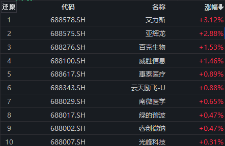 截至发稿,科创100指数成分股中,艾力斯涨超3%,亚辉龙涨近3%,百克生物、威胜信息涨逾1%,惠泰医疗、云天励飞-U、南微医学、绿的谐波、睿创微纳、光峰科技等小幅上涨。