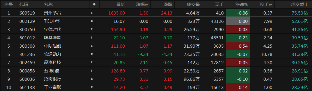 个股方面,贵州茅台成交额居首,为75.50亿元。其次是TCL中环、宁德时代、隆基绿能、中际旭创,成交额分别为52.61亿元、41.36亿元、39.59亿元、35.74亿元。