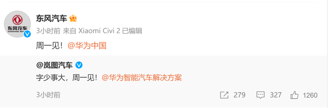 而华为中国和东风汽车则转发上述信息,同时一致互动称“周一见”,疑似集体暗示华为将与东风汽车旗下岚图汽车会有大事发生,具体信息将于1月22日公布。