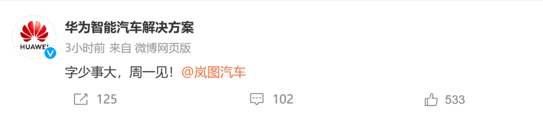 1月20日午间,华为智能汽车解决方案、岚图汽车、华为中国和东风汽车等多个官方微博集体发文。其中华为智能汽车解决方案和岚图汽车均发布“字少事大,周一见!”,同时相互@到对方。