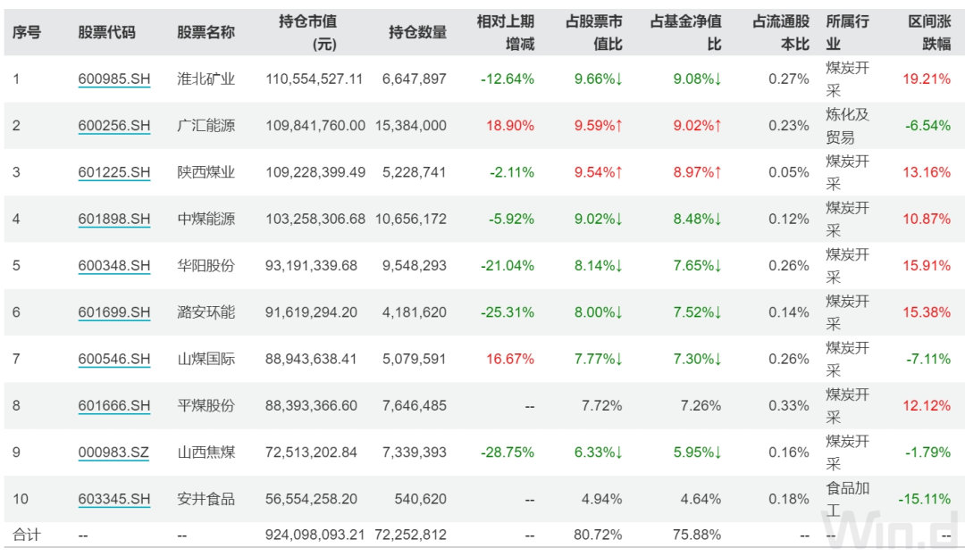 在持仓调整完成后,截至2023年末,该基金曾经的第一大重仓股潞安环能掉落至第六大重仓股,而淮北矿业在遭遇减持的情况下仍然跃升至第一大重仓,广汇能源、陕西煤业分别位列第二、三大重仓股。