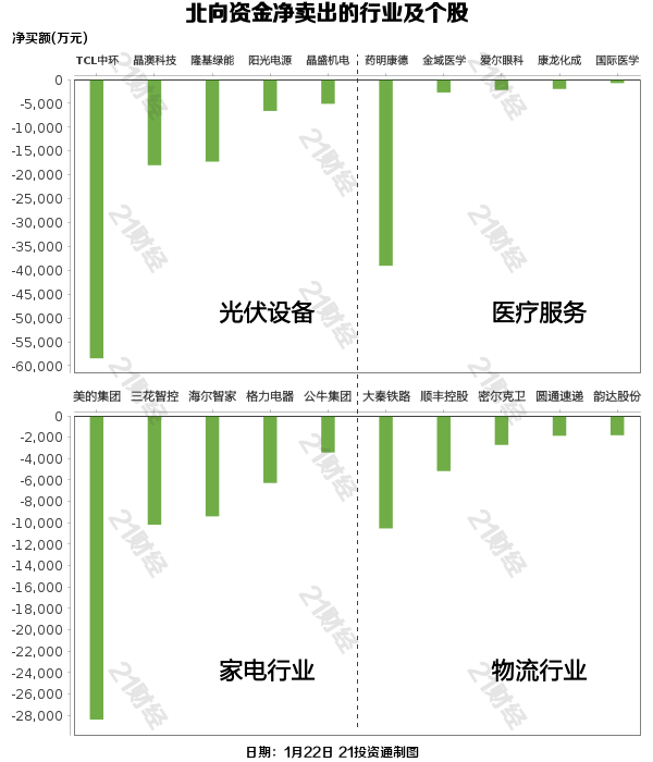 北向资金减持了44个行业,其中光伏设备最多,净卖出金额达7.73亿元,其次是医疗服务行业,净卖出3.64亿元。