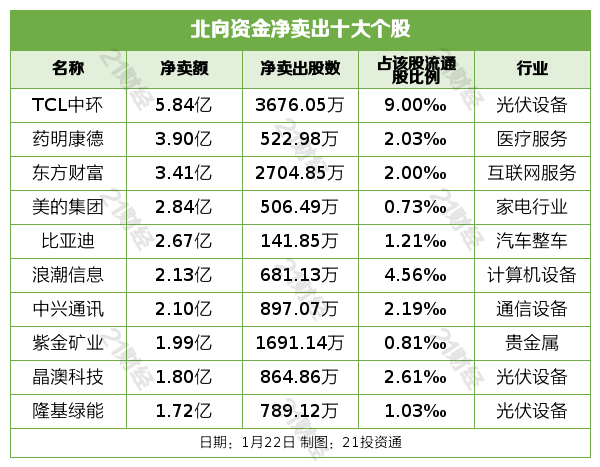 北向资金净卖出TCL中环(002129.SZ)、药明康德(603259.SH)、东方财富(300059.SZ)、美的集团(000333.SZ)、比亚迪(002594.SZ)居前,其中,TCL中环被净卖出5.84亿元,药明康德被净卖出3.90亿元,东方财富被净卖出3.41亿元,美的集团被净卖出2.84亿元,比亚迪被净卖出2.67亿元。