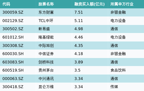 1月24日,两市共有3329只个股有融资资金买入,其中东方财富、TCL中环、新易盛排名前三,买入金额分别7.51亿元、5.11亿元、4.98亿元。融资买入额前10个股详情见下表: