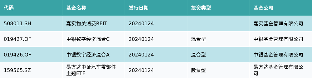 1月24日有4只新基金发行,分别为:嘉实物美消费REIT、中银数字经济混合C、中银数字经济混合A、易方达中证汽车零部件主题ETF,详情见下表: