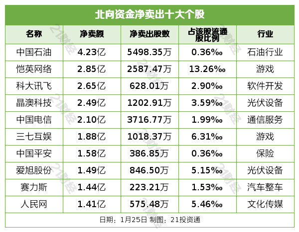 北向资金净卖出中国石油(601857.SH)、恺英网络(002517.SZ)、科大讯飞(002230.SZ)、晶澳科技(002459.SZ)、中国电信(601728.SH)居前,其中,中国石油被净卖出4.23亿元,恺英网络被净卖出2.85亿元,科大讯飞被净卖出2.65亿元,晶澳科技被净卖出2.49亿元,中国电信被净卖出2.10亿元。