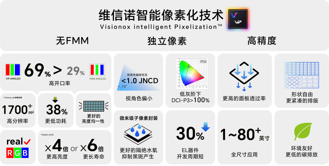 在当天广州举行的2023世界超高清视频产业发展大会上,维信诺全球首发了无精密金属掩膜板RGB自对位像素化技术(即维信诺ViP技术)。
