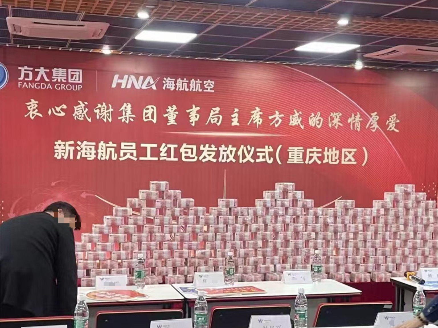 现场照片显示,海航航空集团在重庆举行了新海航员工红包发放仪式,百元现金堆起的一堵墙成为焦点,背景写上了“衷心感谢集团董事局主席方威的深情厚爱。”