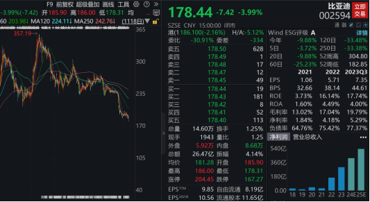 相较于不断创新高的业绩,比亚迪股价表现较差。自2023年下半年以来,公司A股股价一路向下,最新价为178.44元。