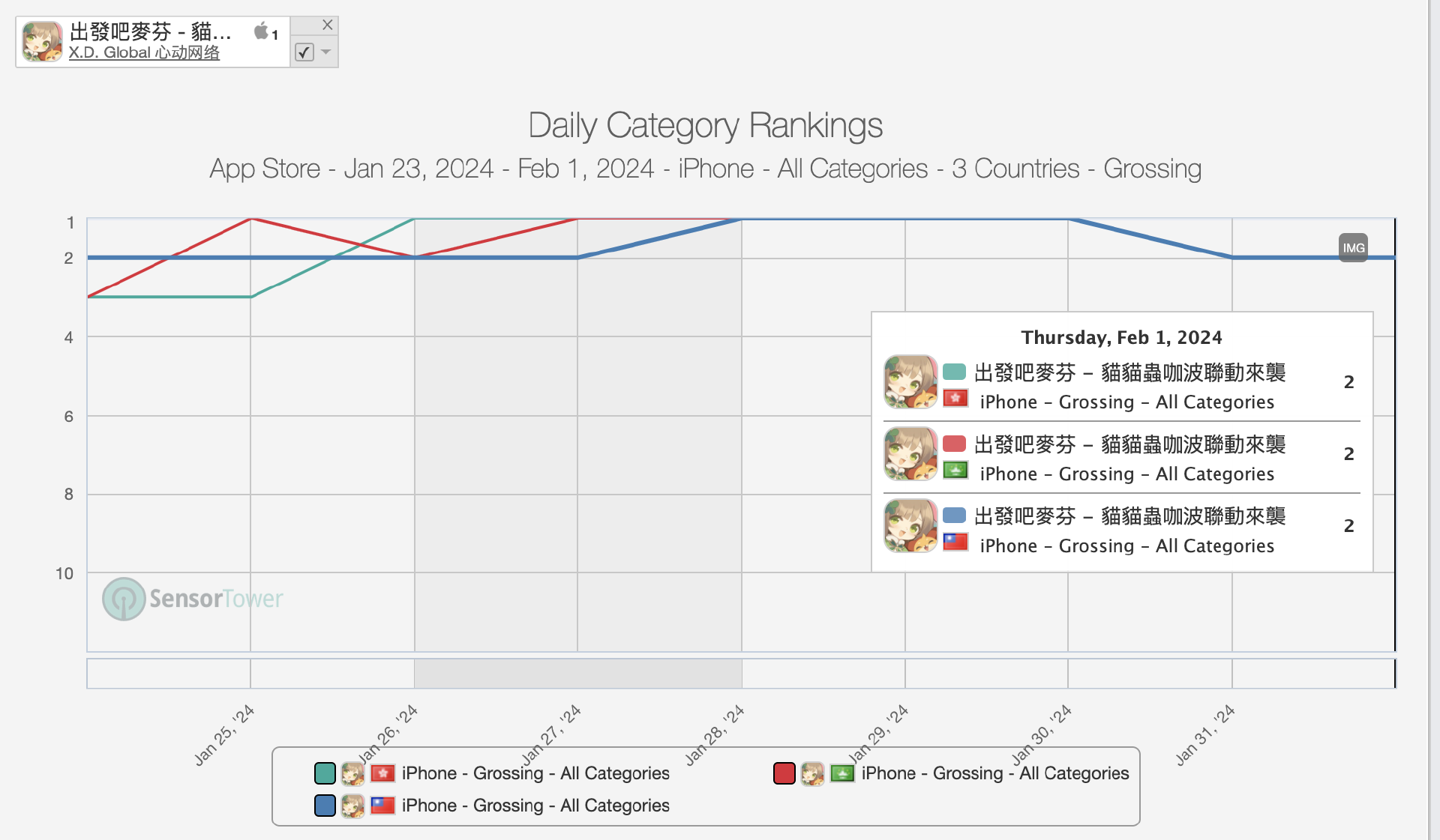 综合近期动态来看,公司产品在出海目的地的超预期表现可能是资金看好的重要因素之一。21世纪经济报道记者关注到,1月24日,心动旗下自研放置RPG《出发吧麦芬》(以下简称“《麦芬》”)于港澳台地区正式上线。SensorTower数据显示,2月1日《麦芬》在港澳台地区均位居iOS全品类畅销榜(Grossing)第二名,仅次于米哈游旗下《原神》。而在此前的1月28日至30日,该游戏更是在港澳台iOS畅销榜连续3天位居第一。