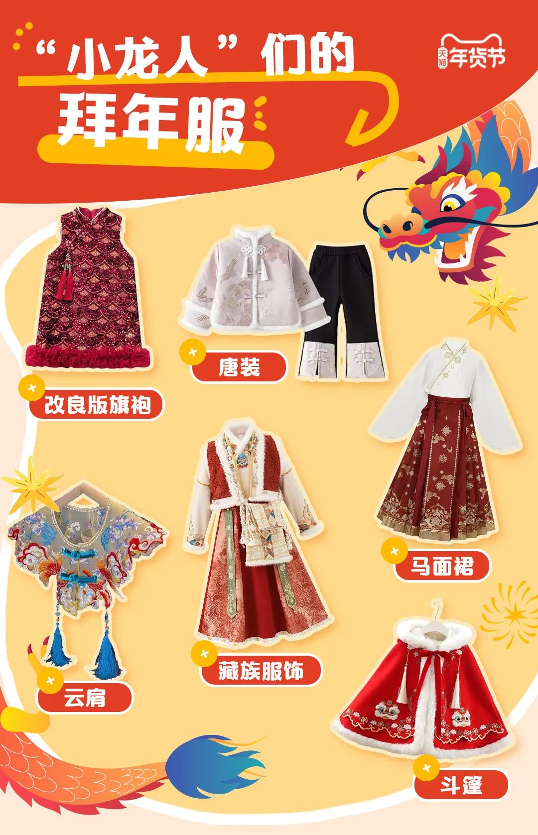 “绣着卡通龙图案的红棉服太喜庆啦!我还买了件小云肩给宝宝做搭配,过年的时候穿着会很有氛围感。”谈及年货购物车时,一位网友表示,自己已经给孩子准备好了“过年战袍”。