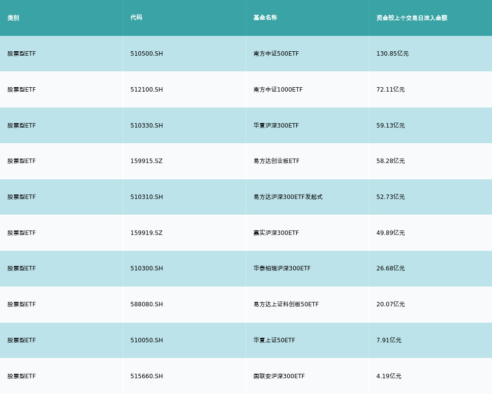 昨日股票型ETF资金流入最多的3支ETF及其流入金额分别为:南方中证500ETF(流入130.85亿元)、南方中证1000ETF(流入72.11亿元)、华夏沪深300ETF(流入59.13亿元)。资金流入前10详情见下表: