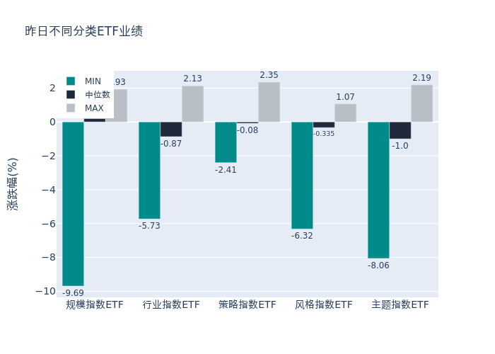 昨日股票型ETF收益率中位数为-0.71%。其中按照不同分类,规模指数中嘉实富时中国A50ETF收益率最高,为1.93%;行业指数中易方达沪深300医药ETF收益率最高,为2.13%;策略指数中华夏创业板低波价值ETF收益率最高,为2.35%;风格指数中华夏中证智选300成长创新策略ETF收益率最高,为1.07%;主题指数中平安中证医疗创新ETF收益率最高,为2.19%。