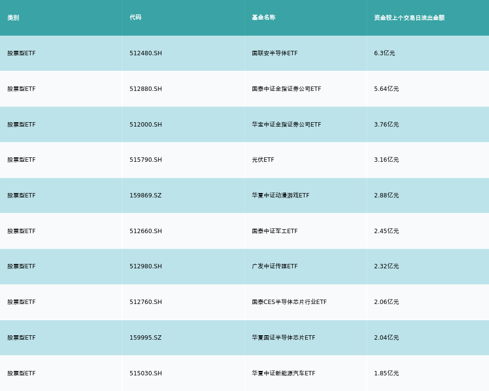昨日股票型ETF资金流出最多的3支ETF及其流入金额分别为:国联安半导体ETF(流出6.3亿元)、国泰中证全指证券公司ETF(流出5.64亿元)、华宝中证全指证券公司ETF(流出3.76亿元)。资金流出前10详情见下表: