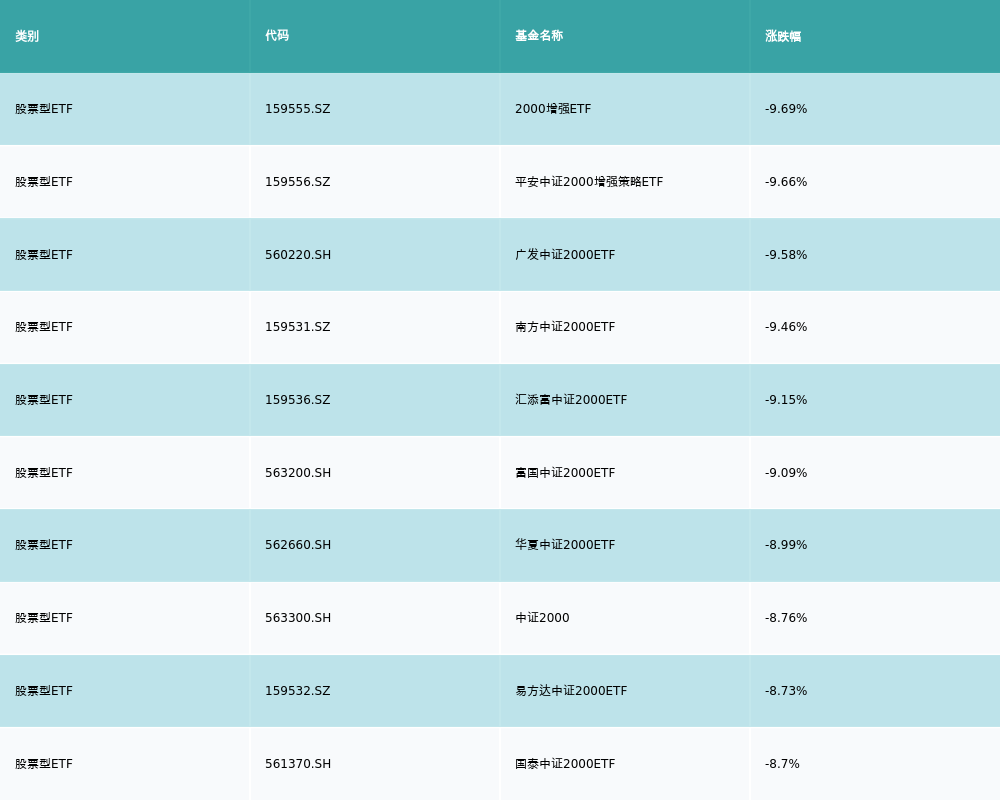 昨日股票型ETF跌幅最大的3支ETF及其收益率分别为:2000增强ETF(-9.69%)、平安中证2000增强策略ETF(-9.66%)、广发中证2000ETF(-9.58%)。跌幅前10详情见下表: