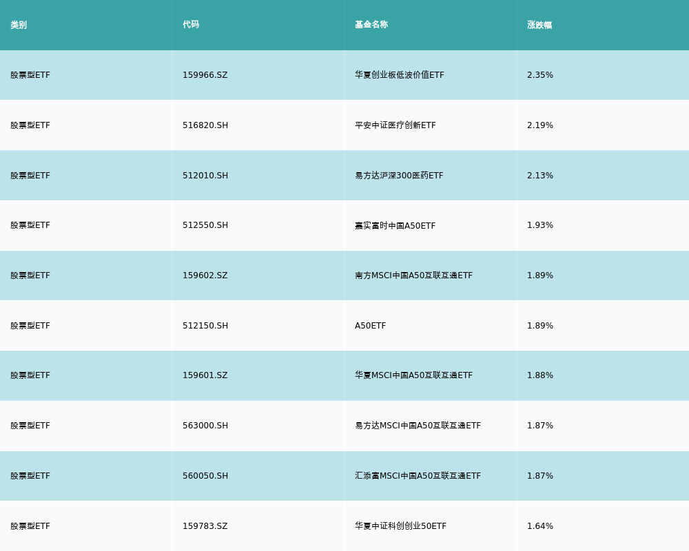昨日股票型ETF涨幅最高的3支ETF及其收益率分别为:华夏创业板低波价值ETF(2.35%)、平安中证医疗创新ETF(2.19%)、易方达沪深300医药ETF(2.13%)。涨幅前10详情见下表: