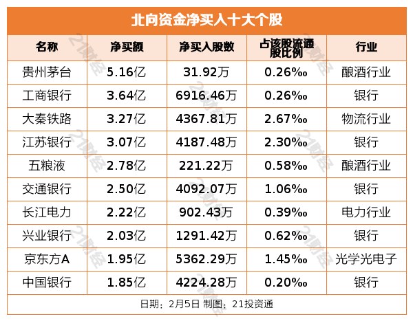 个股方面,北向资金净买入贵州茅台(600519.SH)、工商银行(601398.SH)、大秦铁路(601006.SH)、江苏银行(600919.SH)、五粮液(000858.SZ)居前,其中,贵州茅台被净买入5.16亿元,工商银行被净买入3.64亿元,大秦铁路被净买入3.27亿元,江苏银行被净买入3.07亿元,五粮液被净买入2.78亿元。