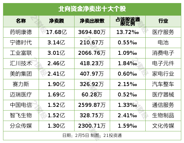 北向资金净卖出药明康德(603259.SH)、宁德时代(300750.SZ)、工业富联(601138.SH)、汇川技术(300124.SZ)、美的集团(000333.SZ)居前,其中,药明康德被净卖出17.68亿元,宁德时代被净卖出3.14亿元,工业富联被净卖出3.01亿元,汇川技术被净卖出2.46亿元,美的集团被净卖出2.41亿元。