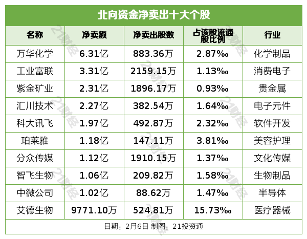 北向资金净卖出万华化学(600309.SH)、工业富联(601138.SH)、紫金矿业(601899.SH)、汇川技术(300124.SZ)、科大讯飞(002230.SZ)居前,其中,万华化学被净卖出6.31亿元,工业富联被净卖出3.31亿元,紫金矿业被净卖出2.31亿元,汇川技术被净卖出2.27亿元,科大讯飞被净卖出1.97亿元。