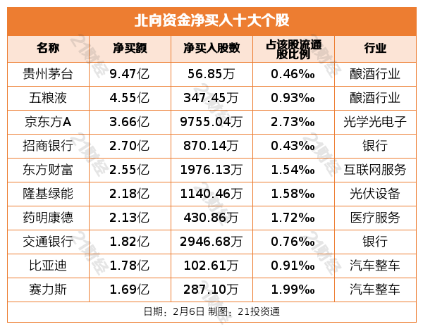 个股方面,北向资金净买入贵州茅台(600519.SH)、五粮液(000858.SZ)、京东方A(000725.SZ)、招商银行(600036.SH)、东方财富(300059.SZ)居前,其中,贵州茅台被净买入9.47亿元,五粮液被净买入4.55亿元,京东方A被净买入3.66亿元,招商银行被净买入2.70亿元,东方财富被净买入2.55亿元。