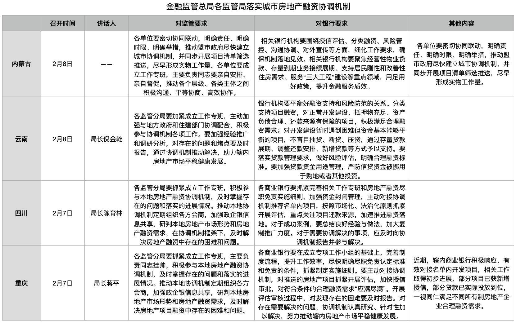 2月6日,金融监管总局召开专题会议,进一步部署落实城市房地产融资协调机制相关工作,对各监管局和商业银行提出新的要求。会议召开后,近日,多地监管局和商业银行纷纷采取行动落实相关要求。