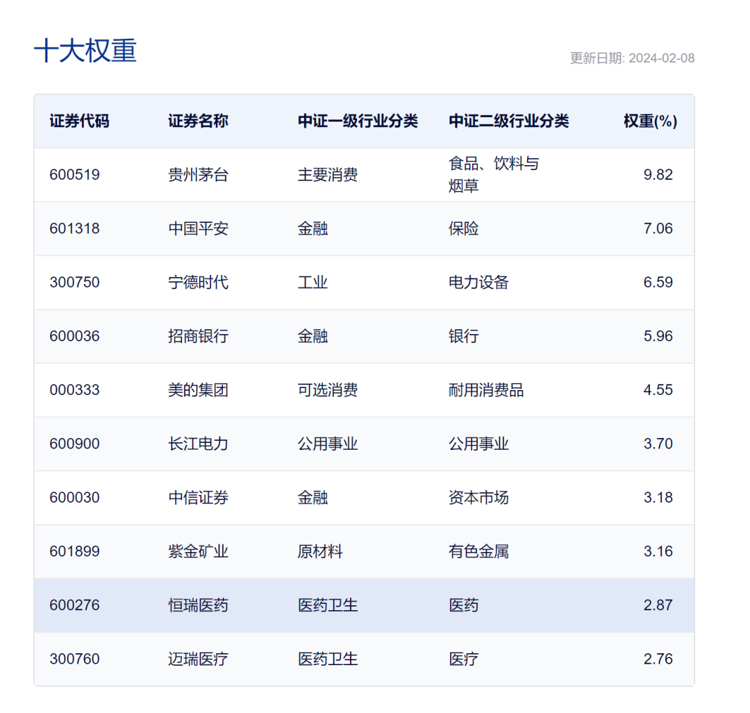中证A50指数的样本股来看,囊括了传统及新兴行业龙头,聚合了一批既处于优质赛道又属于优等生的上市公司。前十大重仓股来看,贵州茅台、中国平安、宁德时代、招商银行、美的集团等位列其中。