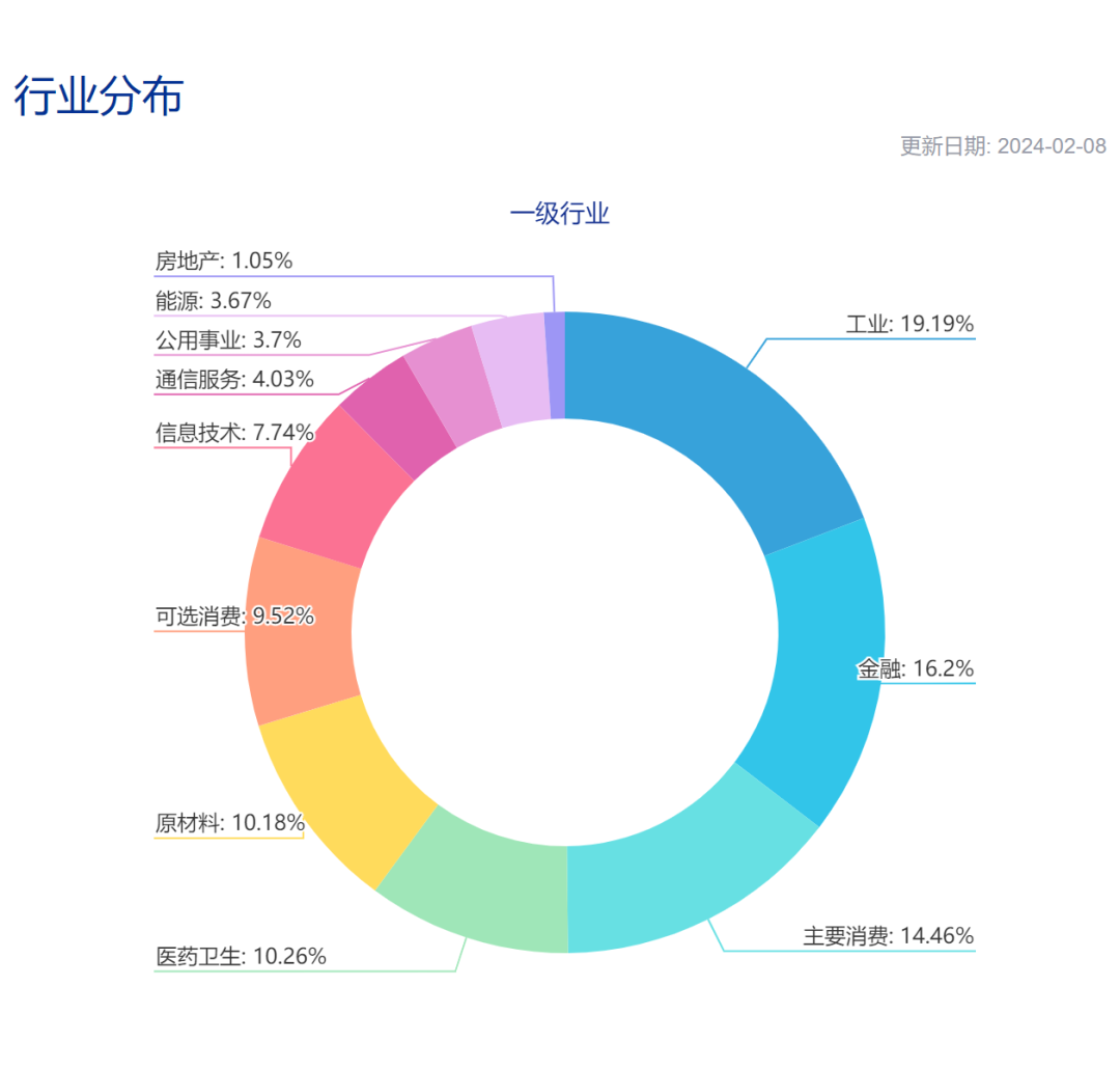 具体来看,中证A50指数样本兼具大市值属性与行业代表性。截至2024年2月8日,指数自由流通市值达到6.95万亿元。从行业分布来看,工业占比最高,为19.19%;随后是金融和主要消费,占比分别为16.2%和14.46%,三大行业共计占比近一半。