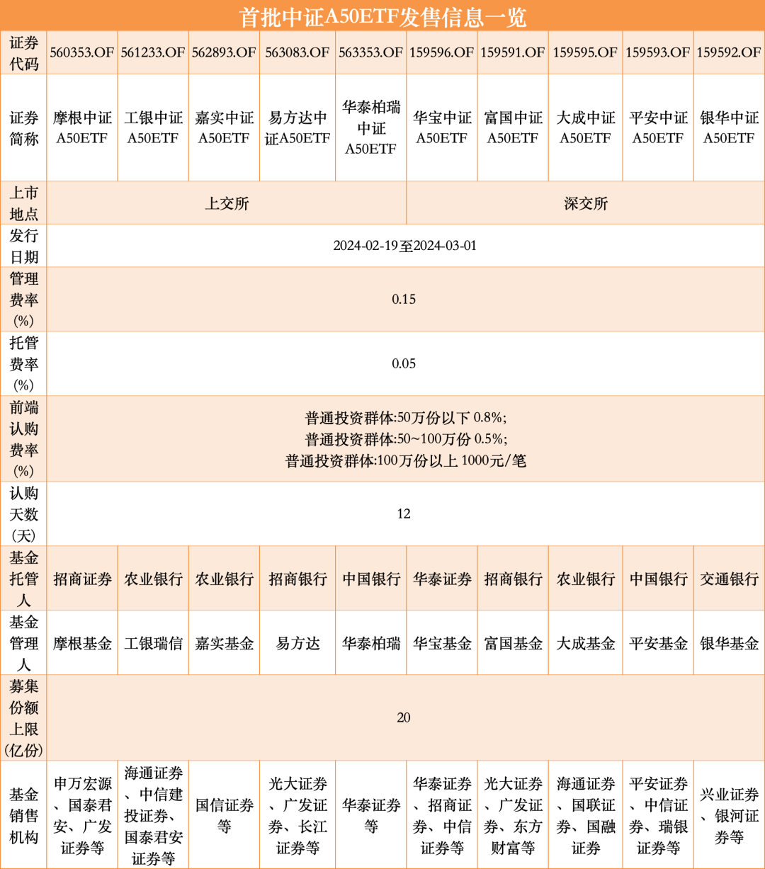 2月2日,国内首批10只中证A50ETF同时获批,而赶在春节前夕,上述10只中证A50ETF已经悉数发布相关招募文件,“官宣”发售日期。