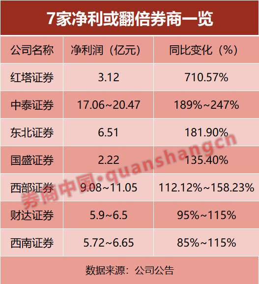 具体来看,按照净利润增速排序来看,去年的净利润同比增长或翻倍的7家券商分别为:红塔证券净利润同比增长710.57%;中泰证券同比增长189%至247%;东北证券同比增长181.9%;国盛证券同比增长135.4%;西部证券同比增长112.12%至158.23%;财达证券同比增长95%至115%;西南证券同比增长85%至115%。