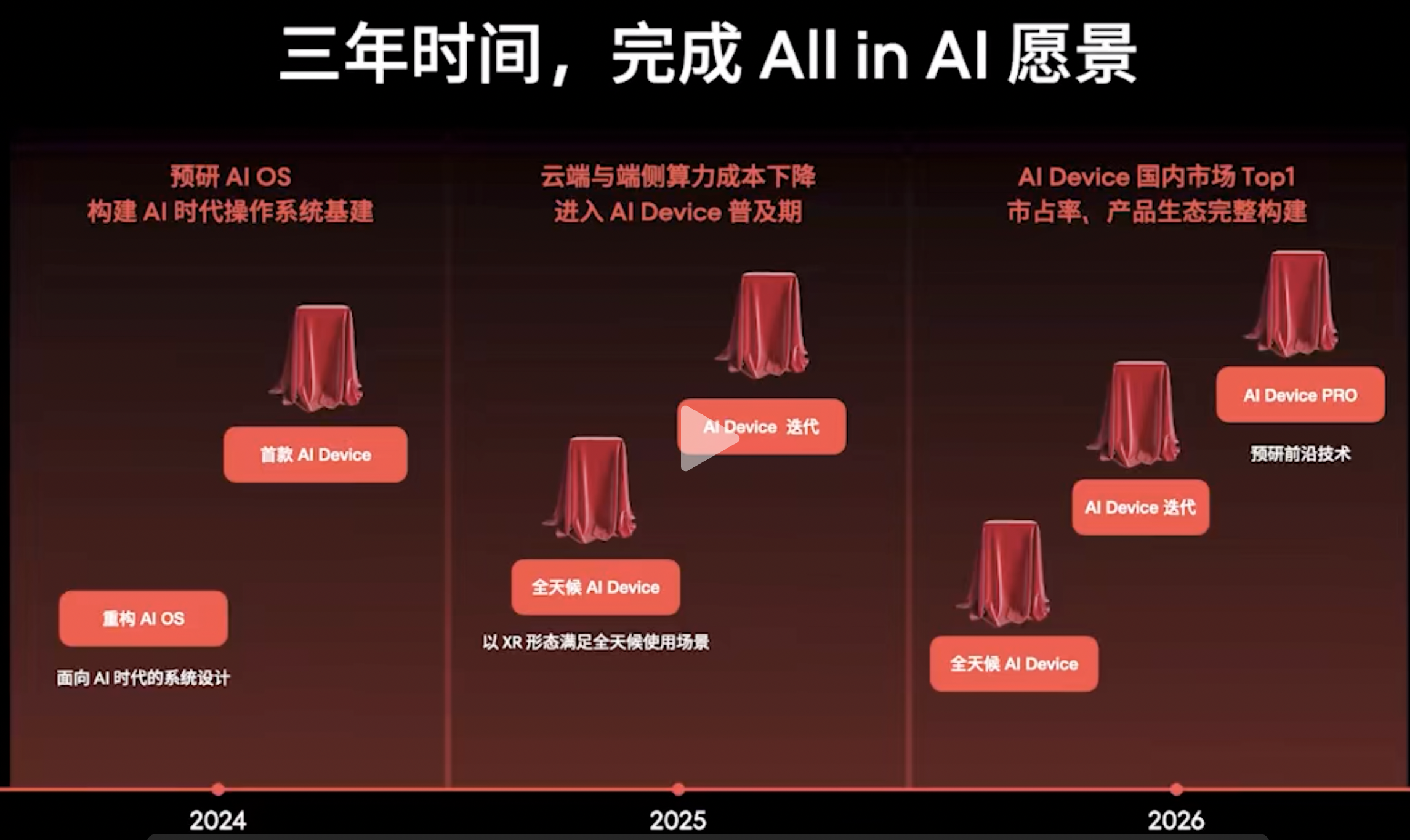 为此,魅族的全新AI硬件设备,将对全球大模型团队全面开放。“积极拥抱Open AI等国际顶级大模型团队,与最前沿的AI技术站在一起,大家一起搭建属于下个时代的AI生态。”根据魅族提出的规划,将用三年时间,完成All in AI愿景:2024年聚焦预研AI OS,构建AI时代的操作系统基建,推出首款AI Device;2025年随着云端和端侧算力成本下降,将进入AI Device普及期,维持AI设备迭代,同时将以XR(混合现实)形态满足全天候的使用场景;2026年魅族提出成为AI Device领域国内市场Top1,涵盖市占率、产品生态完整构建。