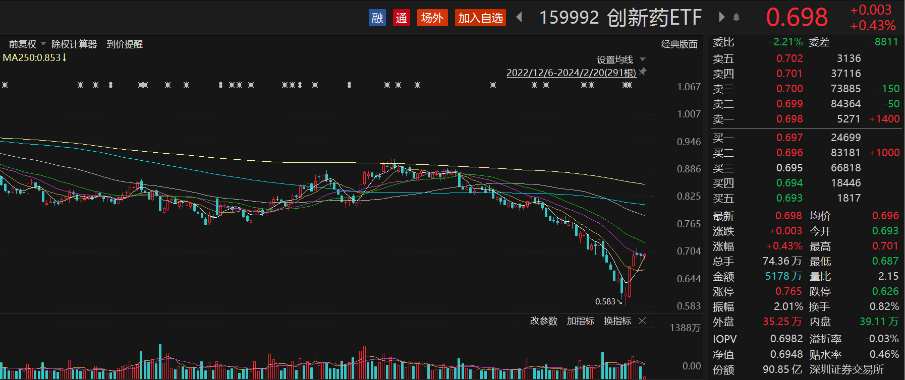 紧密跟踪中证创新药产业指数的ETF中规模最大的创新药ETF(159992)盘中一度涨近1%,现涨0.43%。