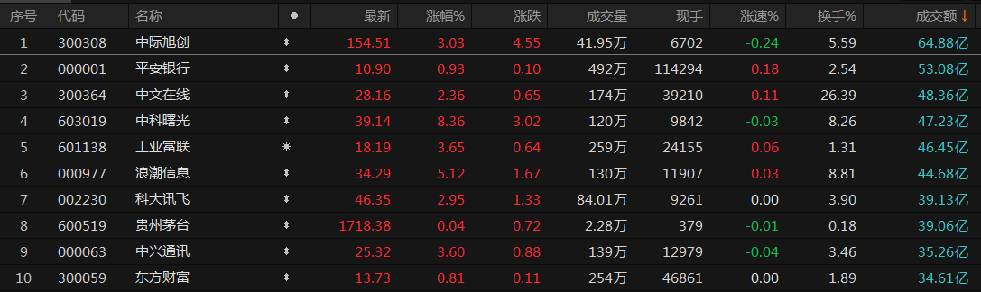 个股方面,中际旭创成交额最高,为64.88亿元,平安银行、中文在线、中科曙光、工业富联、浪潮信息成交额均较前。