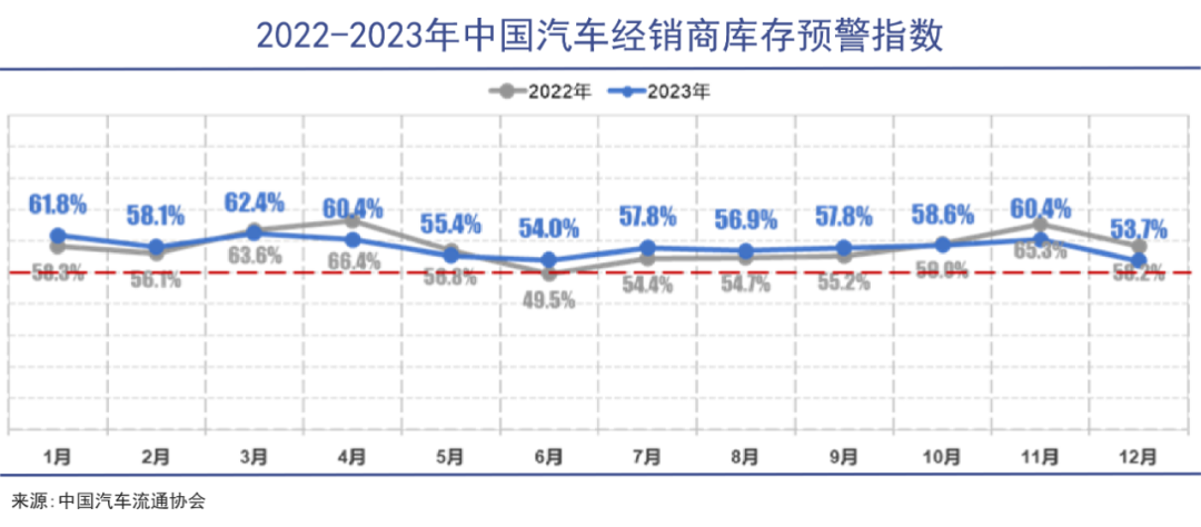 库存预警指数位于荣枯线之上,代表汽车流通行业处在不景气区间。回顾来看,2022年以来,只有一个月处于景气区间,可见经销商们的生存难度之大。