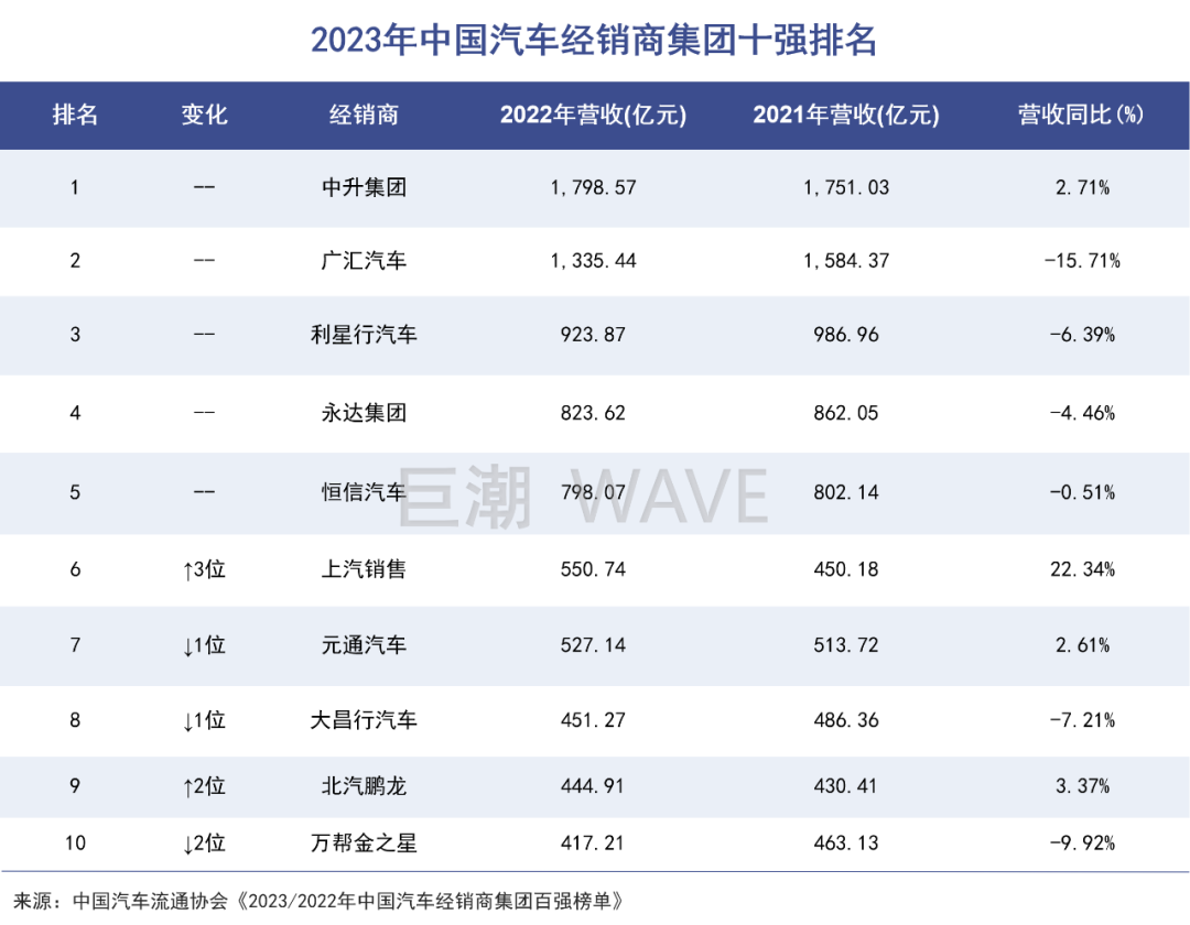 在汽车厂商直接下场干销售的情况下,中升集团虽依旧位居行业第一,但北汽鹏龙、上汽销售已经强势晋级行业前十,并成为前十名中收入增长最快的企业。
