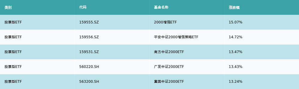 上周股票型ETF涨幅最高的5支ETF及其收益率分别为:2000增强ETF(15.07%)、平安中证2000增强策略ETF(14.72%)、南方中证2000ETF(13.47%)、广发中证2000ETF(13.43%)、富国中证2000ETF(13.24%)。详情见下表: