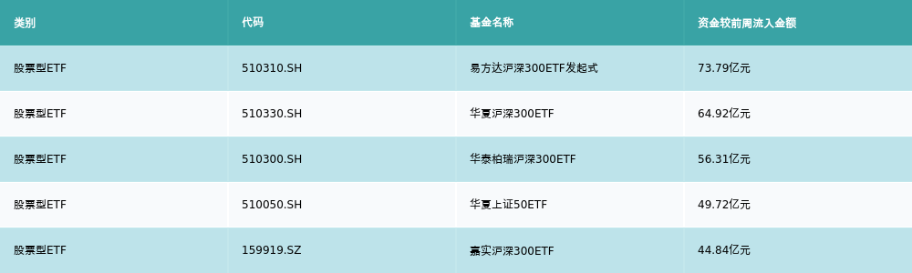 上周股票型ETF资金流入最多的5支ETF及其流入金额分别为:易方达沪深300ETF发起式(流入73.79亿元)、华夏沪深300ETF(流入64.92亿元)、华泰柏瑞沪深300ETF(流入56.31亿元)、华夏上证50ETF(流入49.72亿元)、嘉实沪深300ETF(流入44.84亿元)。详情见下表: