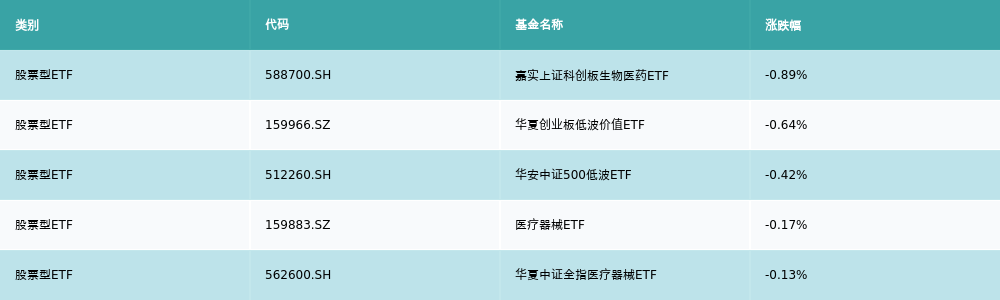 上周股票型ETF跌幅最大的5支ETF及其收益率分别为:嘉实上证科创板生物医药ETF(-0.89%)、华夏创业板低波价值ETF(-0.64%)、华安中证500低波ETF(-0.42%)、医疗器械ETF(-0.17%)、华夏中证全指医疗器械ETF(-0.13%)。详情见下表: