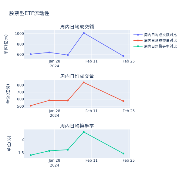 流动性方面,上周股票型ETF市场日均成交额减少43.6%,日均成交量减少31.5%,换手率减少0.79%。