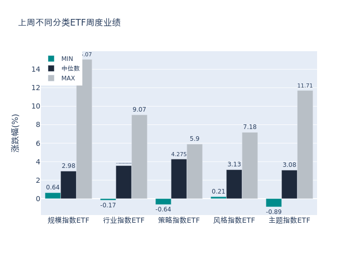 上周股票型ETF周度收益率中位数为3.2%。其中按照不同分类,规模指数中2000增强ETF周度收益率最高,为15.07%;行业指数中华安中证全指软件开发ETF周度收益率最高,为9.07%;策略指数中建信沪深300红利ETF周度收益率最高,为5.9%;风格指数中招商中证银行AH价格优选ETF周度收益率最高,为7.18%;主题指数中华夏中证动漫游戏ETF周度收益率最高,为11.71%。