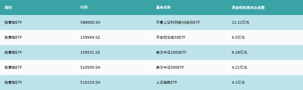 上周股票型ETF资金流出最多的5支ETF及其流入金额分别为:华夏上证科创板50成份ETF(流出12.21亿元)、华安创业板50ETF(流出6.5亿元)、南方中证2000ETF(流出6.28亿元)、南方中证500ETF(流出4.21亿元)、上证指数ETF(流出4.1亿元)。详情见下表: