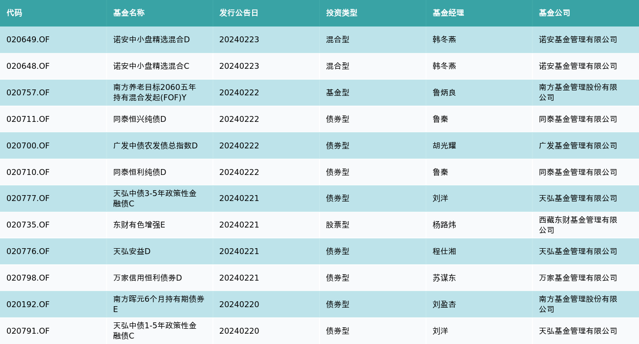 上周有12只新基金发行,分别为:诺安中小盘精选混合D、诺安中小盘精选混合C、南方养老目标2060五年持有混合发起(FOF)Y、同泰恒兴纯债D、广发中债农发债总指数D、同泰恒利纯债D、天弘中债3-5年政策性金融债C、东财有色增强E、天弘安益D、万家信用恒利债券D、南方晖元6个月持有期债券E、天弘中债1-5年政策性金融债C,详情见下表: