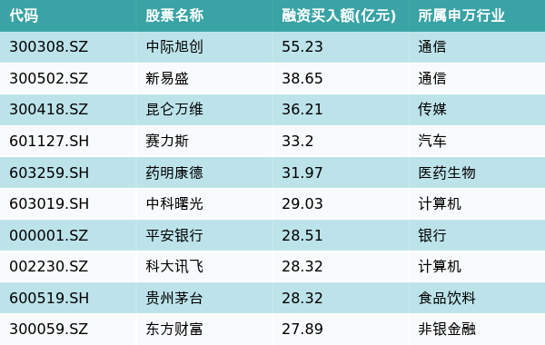 上周两市共有3335只个股有融资资金买入,共有46只个股买入金额超10亿元,其中中际旭创、新易盛、昆仑万维排名前三,买入金额分别55.23亿元、38.65亿元、36.21亿元。融资买入额前10个股详情见下表: