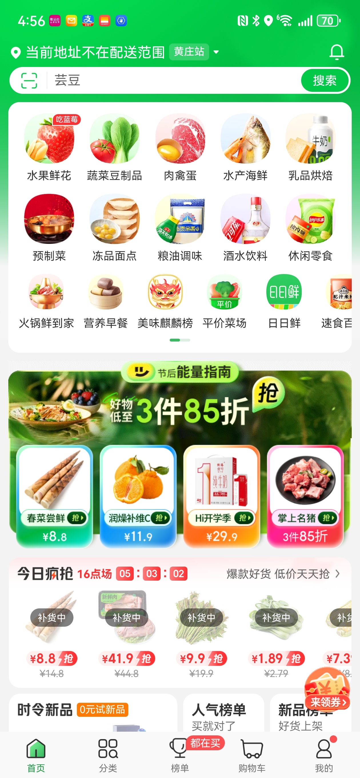 打开“叮咚买菜”的APP,可以看到上面已经显示当前地址不在配送范围,所有的商品页面都已经是灰色。客服告知,此次广东调整的范围包括广州和深圳,部分站点从1月30日起停止运营,用户只能定位至就近站点下单。