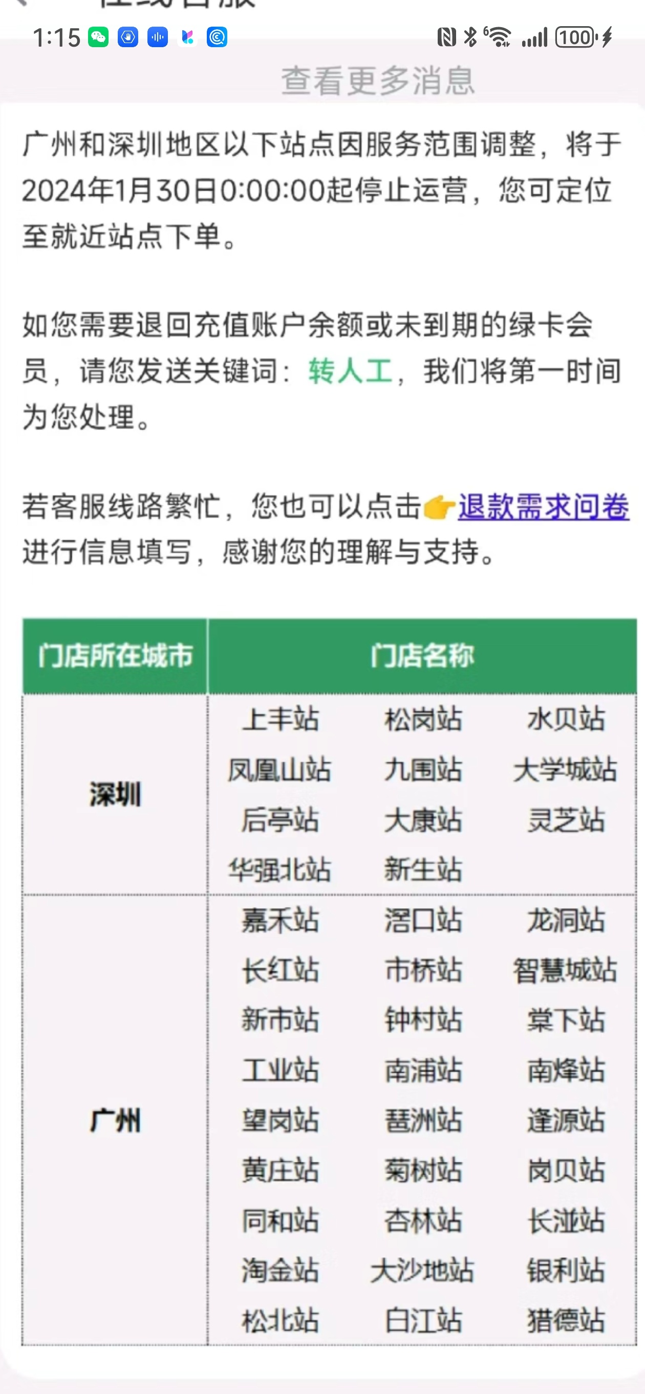 记者通过社交网络发现一个由“叮咚买菜”发出的《通知》,上面列举了此次停止运营的站点名单,其中深圳有11家,广州有27家,《通知》称如需要退回充值账户余额或未到期绿卡会员,请发送关键词转人工,将第一时间处理。叮咚客服也告知记者,公司1月23日已上线公告,告知广州的大部分站点将于1月30日撤离,但仍有部分保留,像天河区还有天河城附近、车陂,南沙区的越秀滨海花城等,但佛山的站点还是正常营业的。
