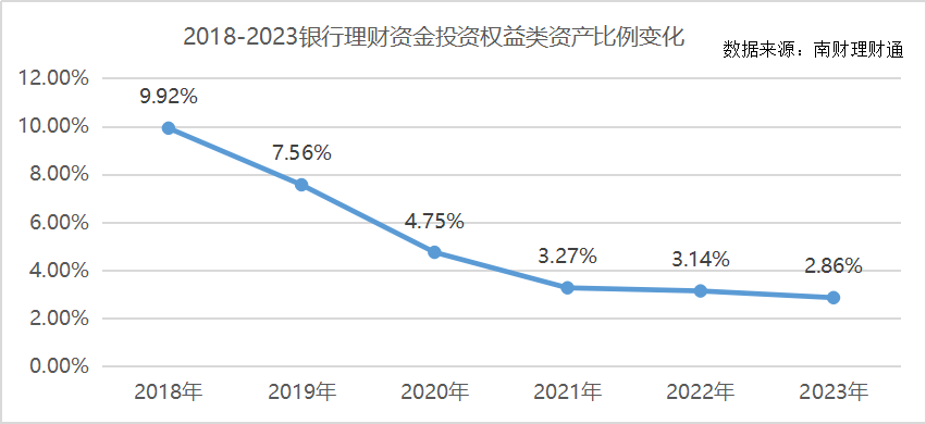 在固收类产品成为主流的同时,银行理财资金投向权益类资产比例也在逐年下降,风险偏好持续下行。银行业理财登记托管中心数据显示,资管新规发布以来,银行理财权益投资比例在2018年末曾达到9.92%的高点,后权益投资比例逐步降低,2023年末权益类资产投资比例已降至2.86%,资产余额为0.83万亿元。