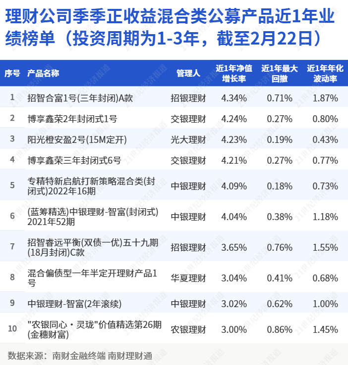 榜单筛选条件:理财公司发行的投资周期在1-3年(含)的公募混合类产品,且近1年每个完整的自然季度季末均为正收益的产品,同系列同投资周期产品保留一只。