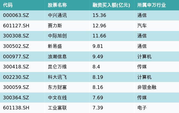 2月27日,两市共有3332只个股有融资资金买入,其中中兴通讯、赛力斯、中际旭创排名前三,买入金额分别15.36亿元、12.96亿元、11.66亿元。融资买入额前10个股详情见下表: